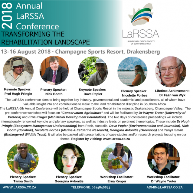 The countdown to the Land Rehabilitation Society of Southern Africa (LaRSSA) 6th annual conference has begun! Here is some more information further to our earlier communication.