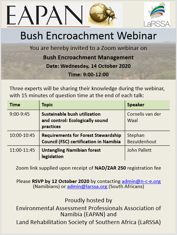 EAPAN is proud to be hosting a Bush Encroachment Webinar on 14 October 2020. Cost: N$250. RSVP by 12th OCtober to admin@n-c-e.org or admin@larssa.org.